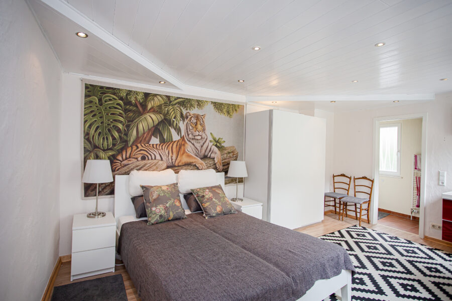 Die Vielseitigkeit im Innenbereich zeigt sich auch Draußen. Hat man hier doch die Möglichkeit, sich im Schatten unter Bäumen ein schönes Plätzchen zu suchen, oder aber man nutzt die Terrasse mit kurzem Weg ins Haus. Auch für das Auto ist genug Platz vor dem Haus und an der Straße lässt sich ebenfalls parken.