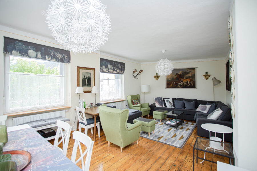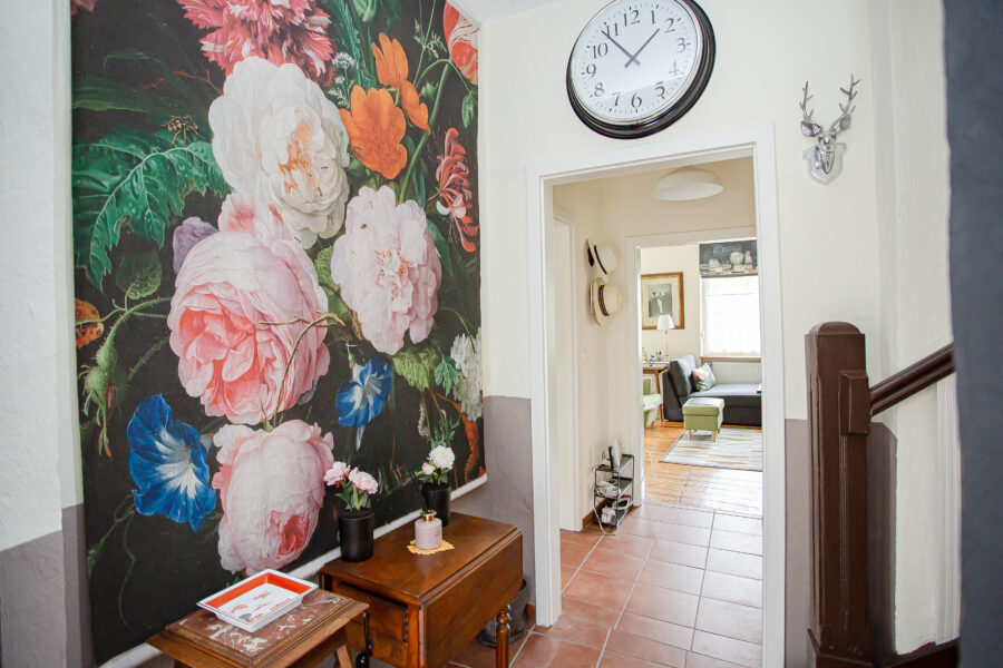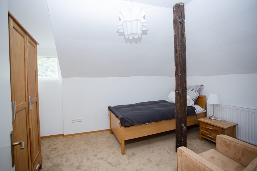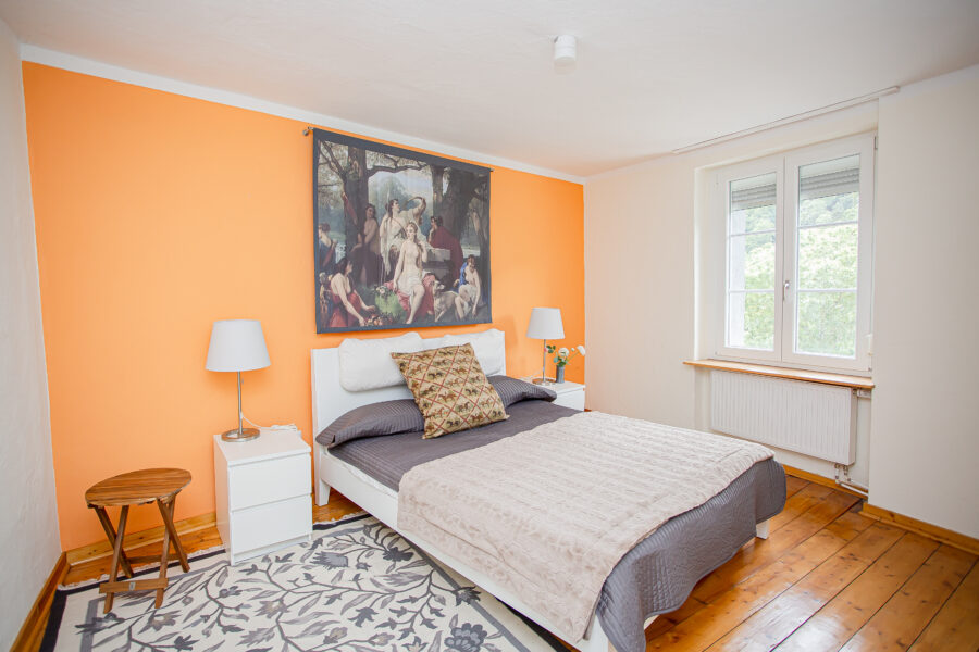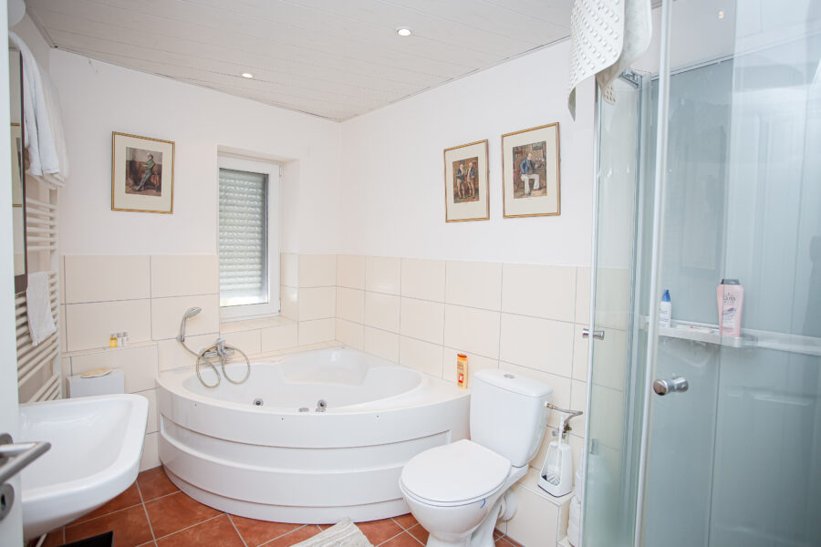 Das Obergeschoss erreichen wir über eine schöne Treppe mit alten Handläufen und Holzstufen. Momentan werden die 3 Zimmer auf dieser Etage als Schlafzimmer und Büro genutzt. Das große Badezimmer verfügt über eine Dusche und eine schöne Eckbadewanne.
