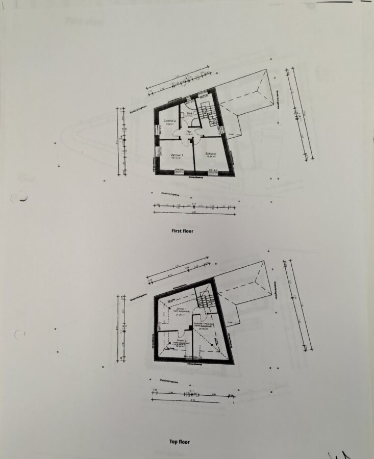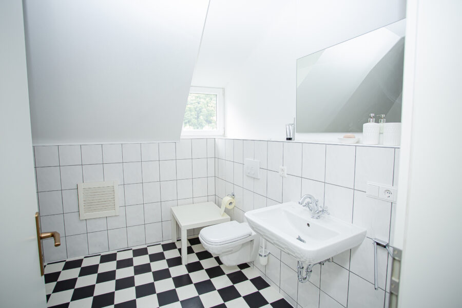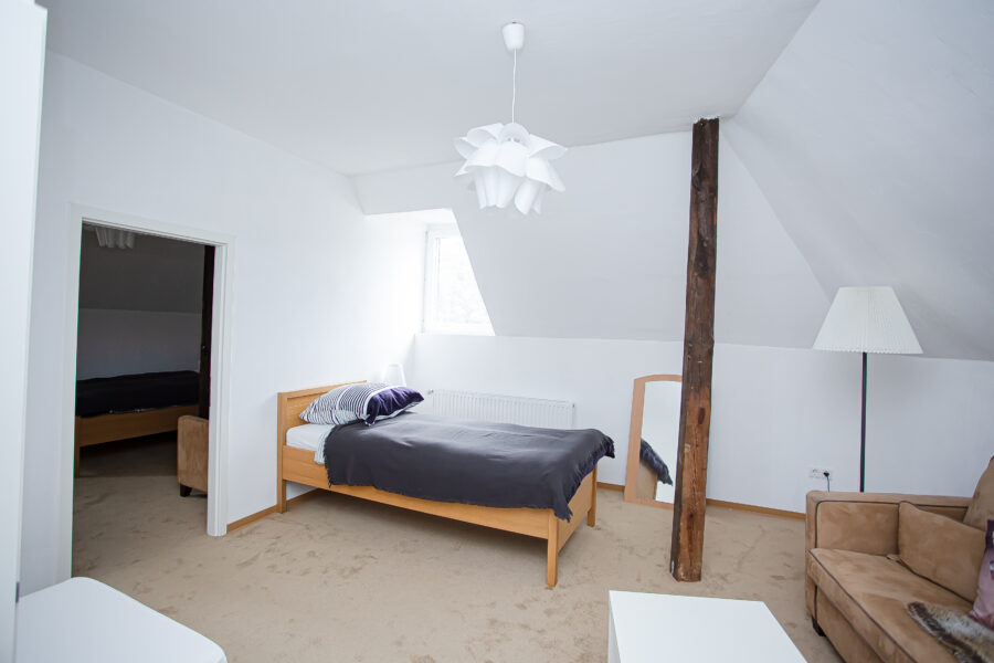 Das ausgebaute Dachgeschoss verfügt nochmals über zwei miteinander verbundene Zimmer, groß genug für zwei Schlafzimmer oder Wohn- u. Arbeitszimmer. Ein weiteres Badezimmer mit Dusche und vorgelagertem Hauswirtschaftsraum ergänzen dieses Stockwerk. Hier sind Anschlüsse für die Waschmaschine vorhanden.