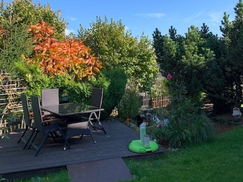 Beinahe alle Räume im Haus sind ebenerdig begehbar, nur zu einem Schlafzimmer und dem Abstellraum führen 4 Stufen. Alle Räumlichkeiten sind gepflegt und müssen nur dem Geschmack des neuen Eigentümers angepasst werden. Auf der Terrasse am schön angelegten Teich im uneinsehbaren Garten, kann man die Sonne genießen und im Sommer mit den Freunden Grillen. Der Garten ist pflegeleicht angelegt, optimal für Hobby-Gärtner und Tierbesitzer. Das Haus ist perfekt für junge Familien zum Dauerwohnen oder als pflegeleichte Ferienimmobilie. Das Dachgeschoss, was von der Straßenseite nahezu ebenerdig begehbar ist, kann zu einer Anliegerwohnung umgebaut werden und dadurch als eine Einnahmequelle dienen.