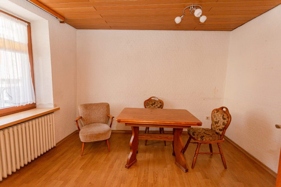 Der Hauseingang ist über eine Treppe erreichbar, die Haustür selbst ist aus massivem Holz, wie auch alle anderen Türen im Haus. Den Eintretenden empfängt ein großzügiger, heller Flur mit Garderobe und Treppenaufgang. Hier im Erdgeschoss befindet sich weiterhin ein Esszimmer und eine Küche mit Durchreiche zum Esszimmer. Das Duschbad ist lichtdurchflutet und für ein Badezimmer erstaunlich groß geschnitten. Am Ende des Flures ist der Zugang zum ebenfalls sehr geräumigen Hauswirtschaftsraum mit Wasseranschlüssen, kleiner Werkbank und Außentür. Die Heiztechnik ist separat im danebenliegenden Raum untergebracht. Ein kleiner Vorratsraum vervollständigt das Erdgeschoss.
