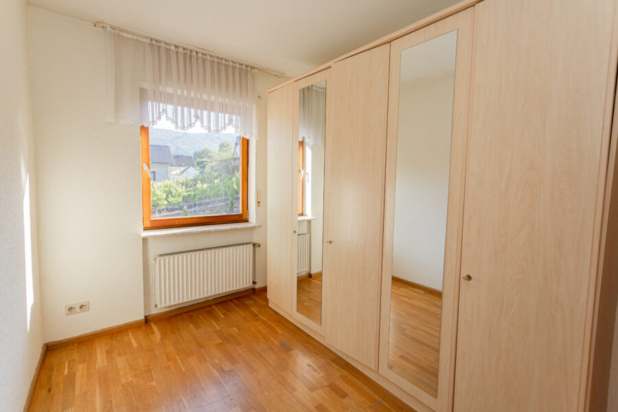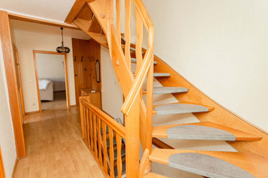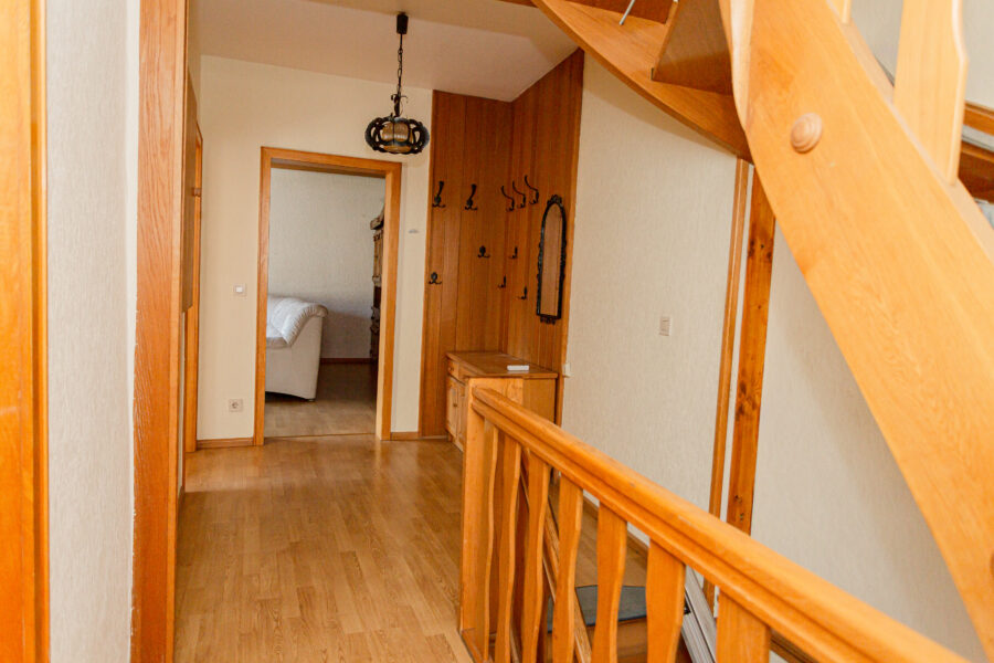 Die schöne Holztreppe führt ins erste Obergeschoss, wo ein großes Wohnzimmer und zwei Schlafzimmer, sowie ein weiteres kleines Duschbad Platz findet. Die Räumlichkeiten sind auch hier hell, freundlich und gut geschnitten.