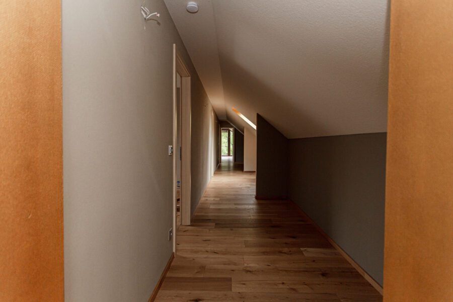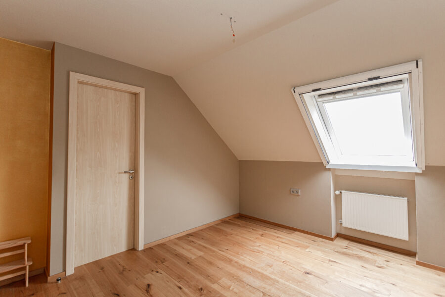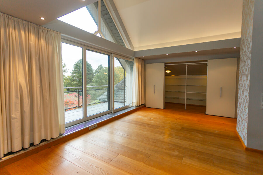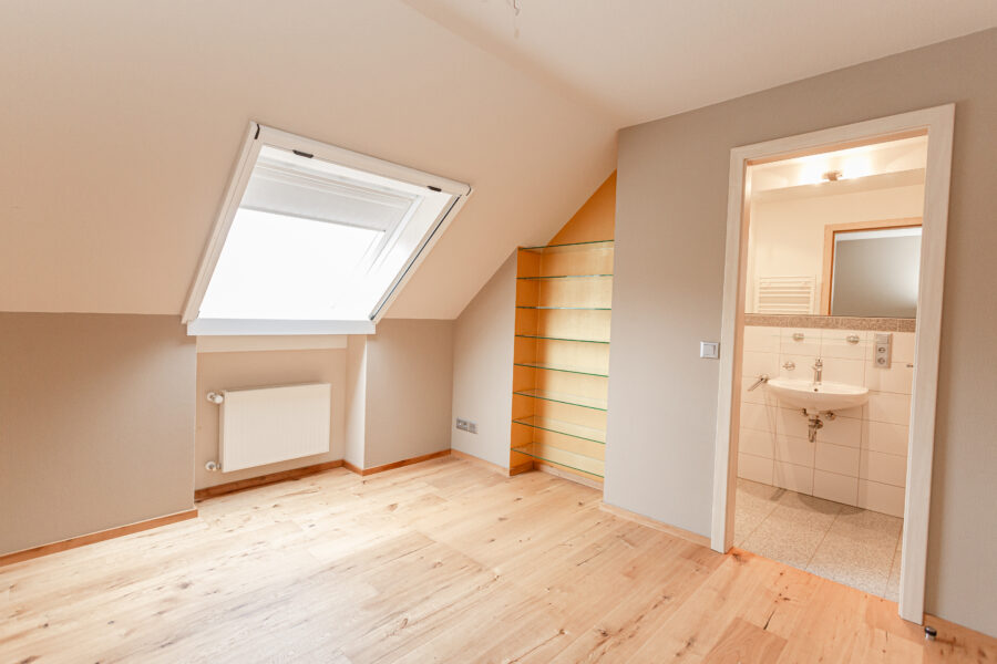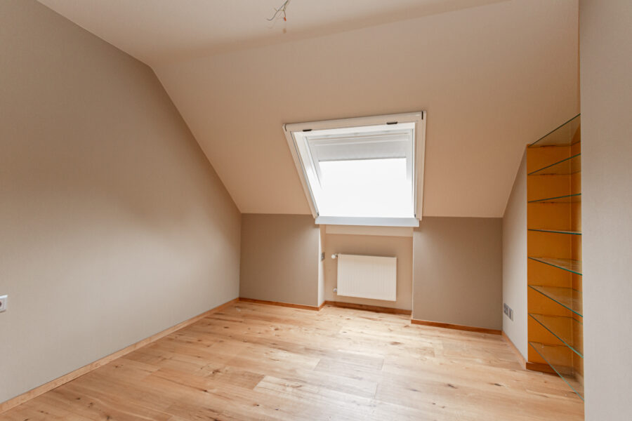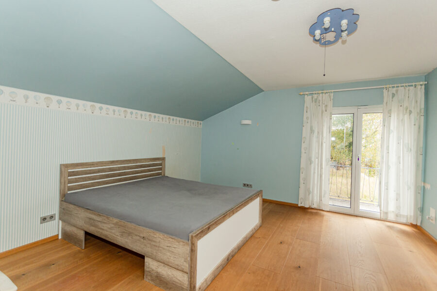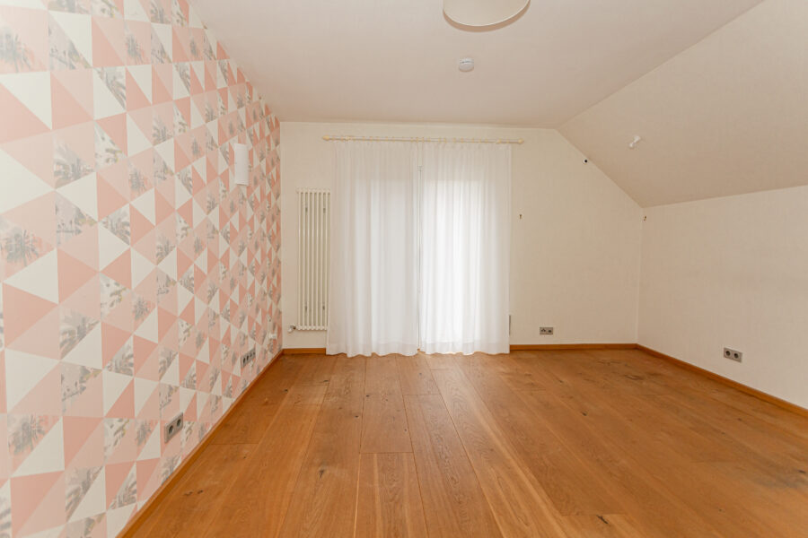 Über eine edle Holztreppe erreicht man den zweiten, offenen Wohnbereich. Von hier aus erreicht man zwei Kinderzimmer, eines davon mit Balkon, sowie ein weiteres Schlafzimmer mit begehbarem Kleiderschrank, mit Balkon und Badezimmer.
