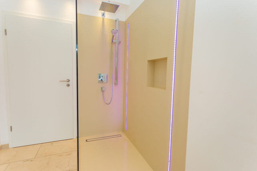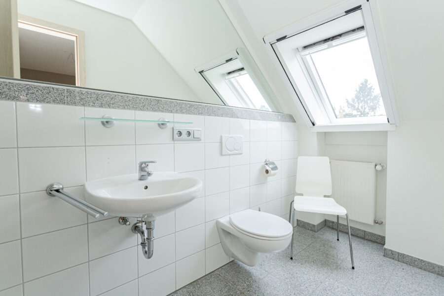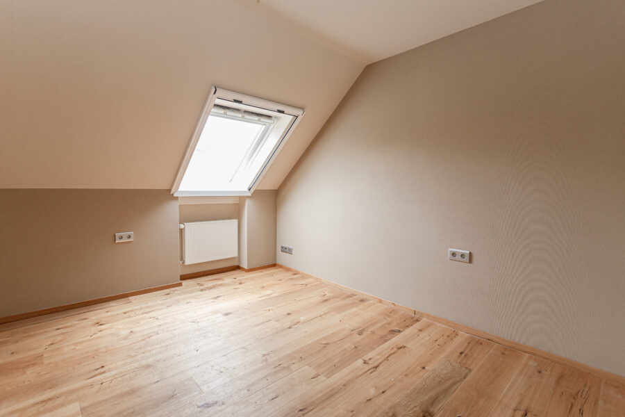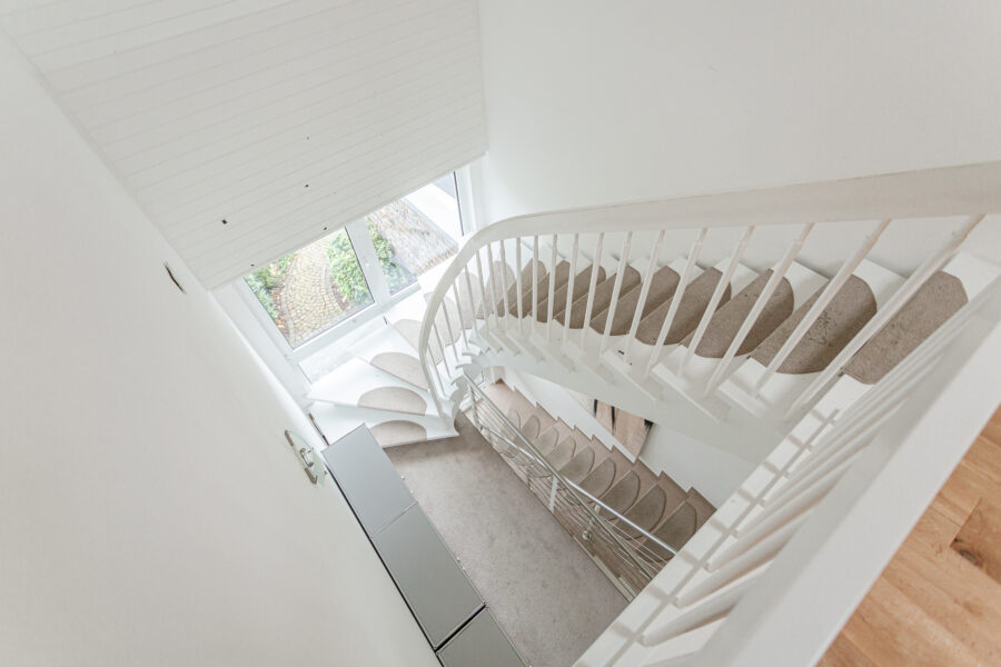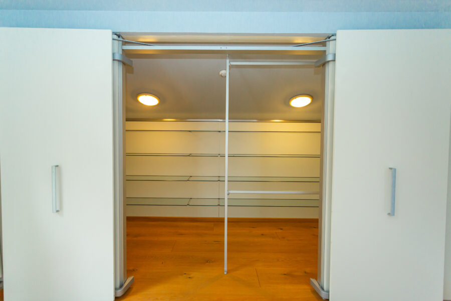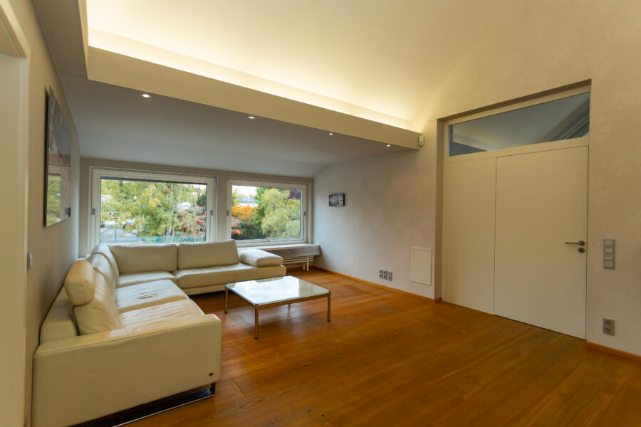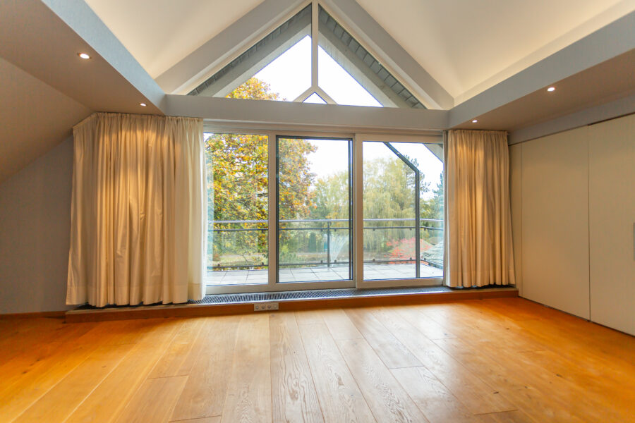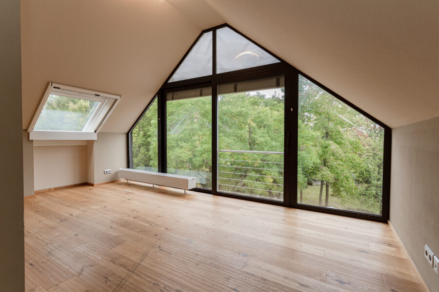 Über eine edle Holztreppe erreicht man den zweiten, offenen Wohnbereich. Von hier aus erreicht man zwei Kinderzimmer, eines davon mit Balkon, sowie ein weiteres Schlafzimmer mit begehbarem Kleiderschrank, mit Balkon und Badezimmer.
