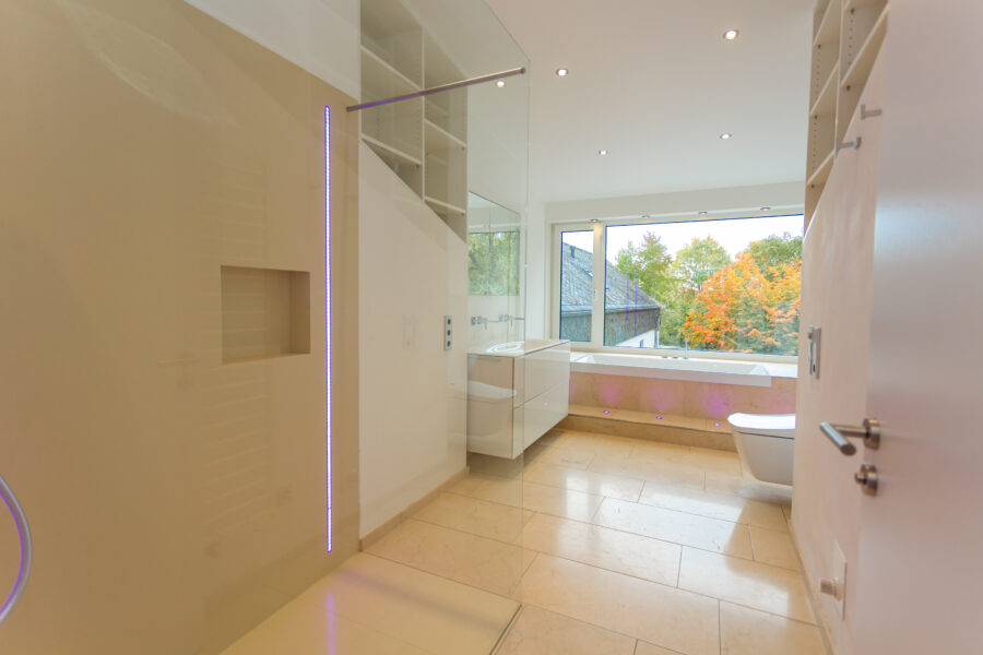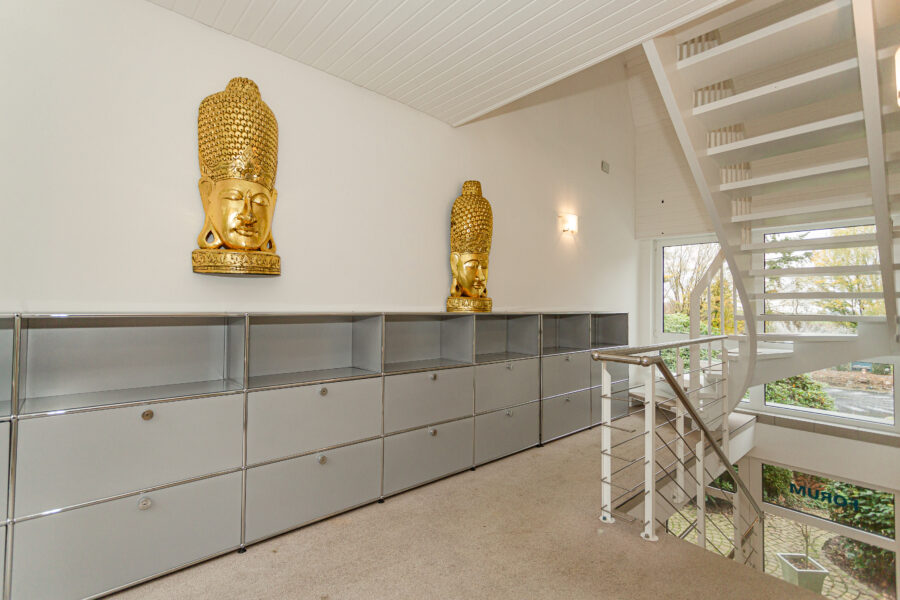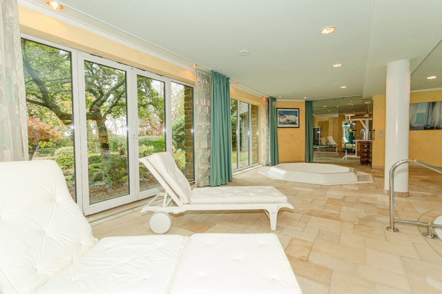 Diese exklusive Immobilie beeindruckt mit außergewöhnlichem Design, erstklassigem Komfort und unzähligen Nutzungsmöglichkeiten. Eingebettet in einen parkähnlichen Garten, der zahlreiche Sitz- und Entspannungsbereiche bietet, vereint dieses Anwesen auf harmonische Weise Wohnen und Arbeiten. Ein Gefühl von Urlaub begleitet die Bewohner in jedem Winkel – sei es beim Frühsport im hauseigenen Fitnessraum, einer entspannenden Schwimmrunde im Schwimmbad oder einem wohltuenden Saunagang nach einem langen Arbeitstag.