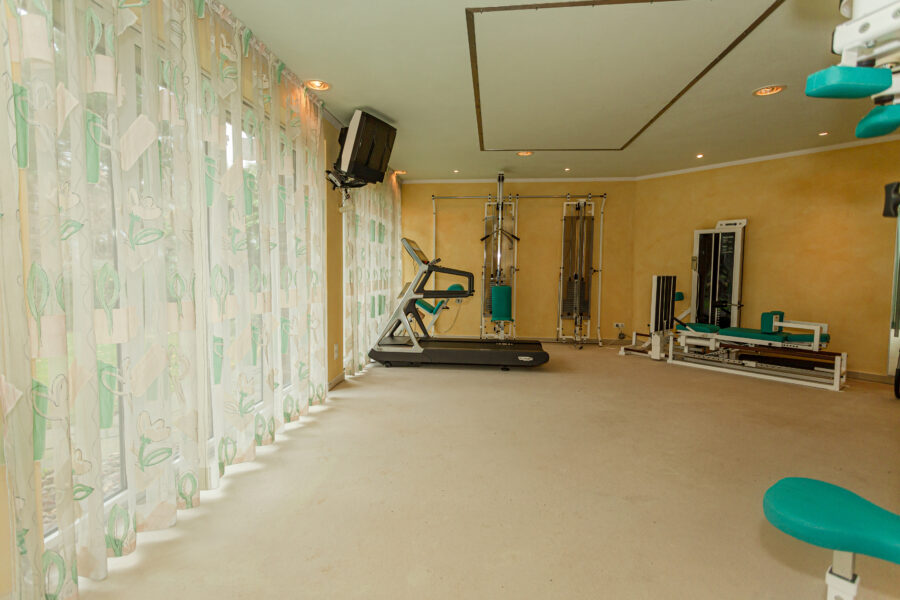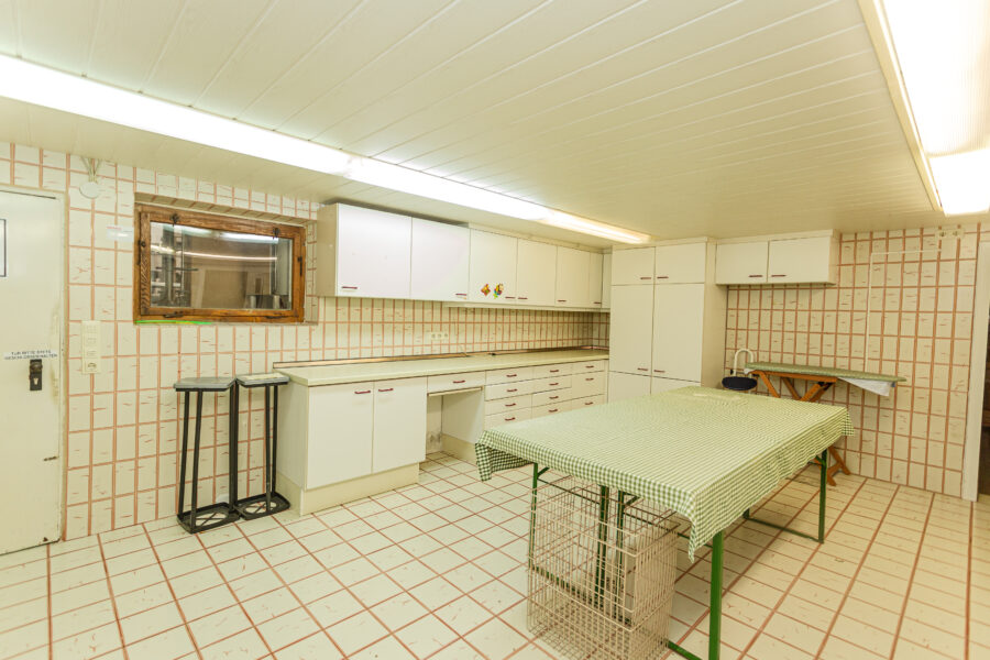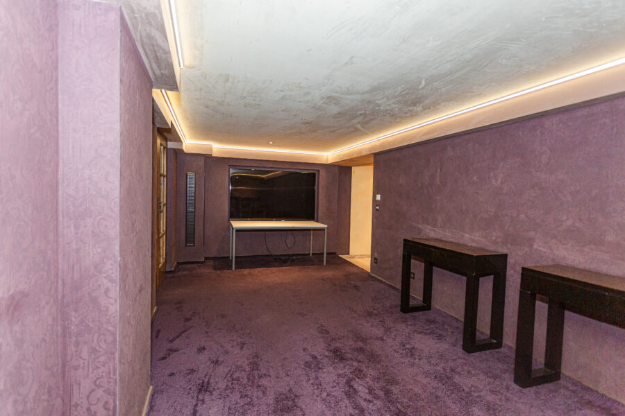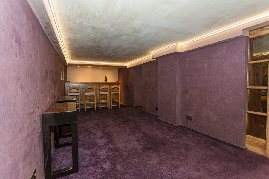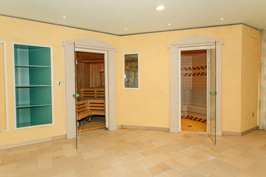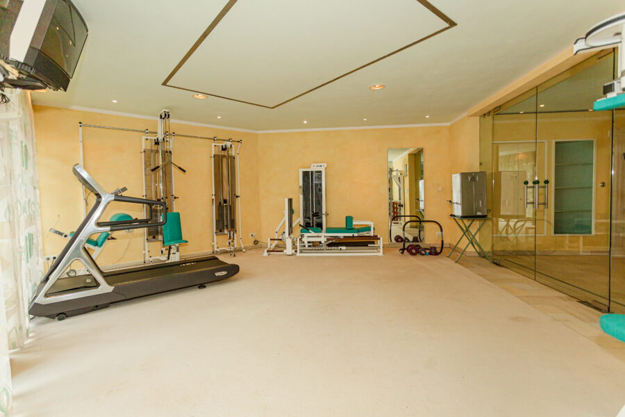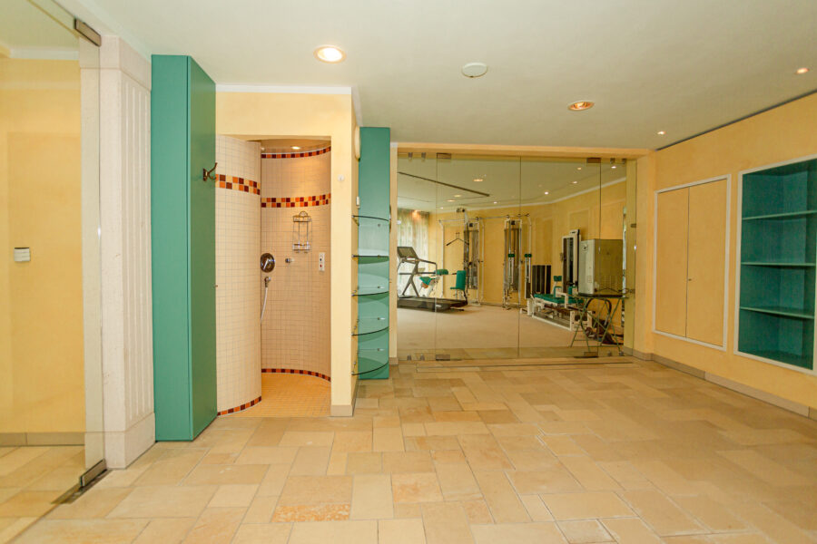Im Kellergeschoss befindet sich der komplette Wellnessbereich, mit einem Fitnessraum, Schwimmbad, Whirlpool, Sauna, Dampfbad, Toiletten, Ruheraum, sowie komplett zu öffnenden Fenstern mit Zugang zum Garten. Der Wellnessbereich wird ergänzt durch eine elegante Bar, eine Bibliothek und einen Weinkeller. Hauswirtschaftsräume und die gesamte Technik sind ebenfalls im Keller untergebracht.
