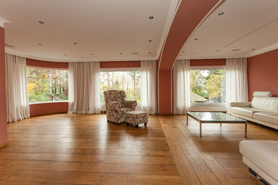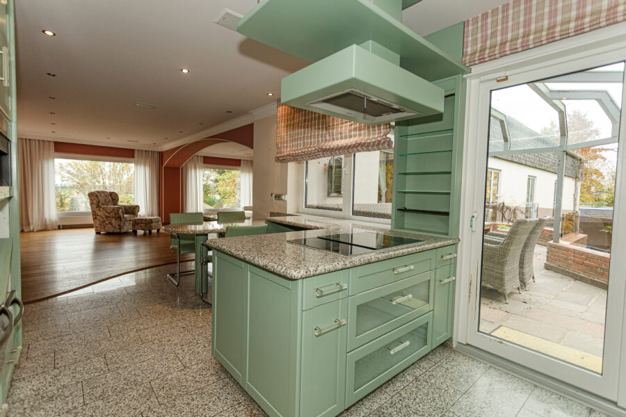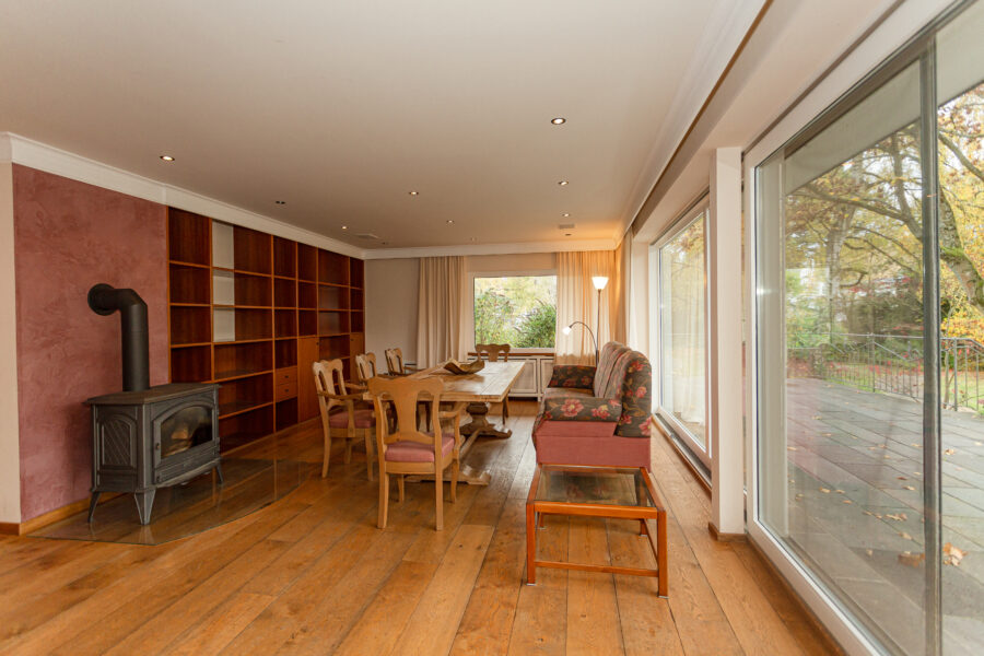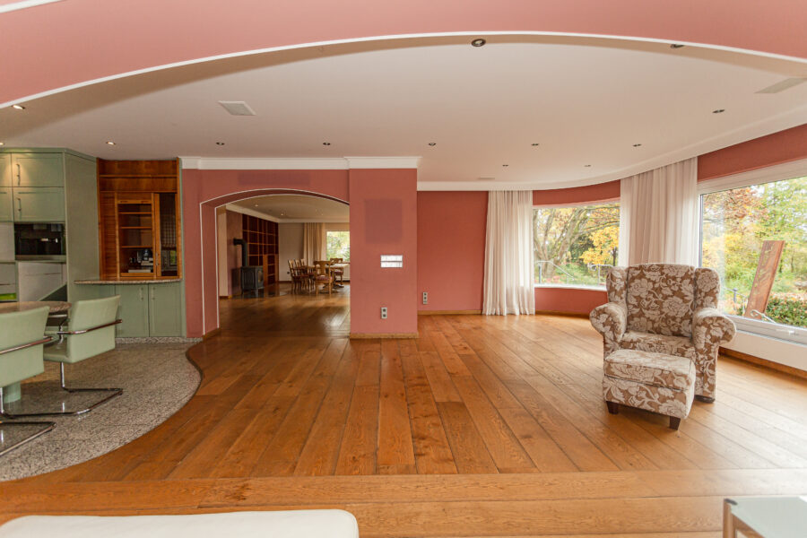 Das lichtdurchflutete Haupthaus empfängt mit großzügigen, teilweise offenen Räumen und ist mit modernster Technik in den Bereichen Beleuchtung und Sicherheit ausgestattet. Der Eingangsbereich führt in das weitläufige Erdgeschoss, das mit seinen großen Fenstern und dem Blick auf die Terrasse und den Garten das Gefühl vermittelt, inmitten der Natur zu leben. Der Wohnbereich erstreckt sich auf über 40 m² und bietet mit seiner Fensterfront und dem direkten Zugang zur Terrasse höchsten Wohnkomfort. Direkt angrenzend befindet sich das Esszimmer, das eine Einheit mit der voll ausgestatteten Küche darstellt. Auch von hier gibt es Zugang zum Pavillon, Teich und Grillplatz, die ideale Bedingungen für kulinarische Abende im Freien schaffen. Ebenfalls auf dieser Ebene befinden sich das Hauptschlafzimmer mit Ankleidezimmer sowie ein Gäste-WC.