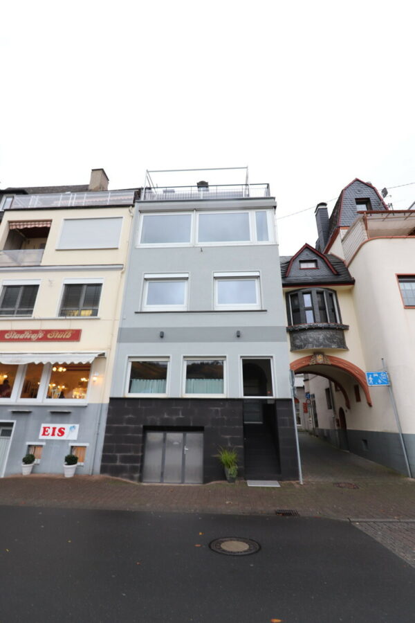 Dieses attraktive Wohn- und Geschäftshaus wurde im Jahr 1920 erbaut und ist seitdem im Familienbesitz. Die letzten Modernisierungsmaßnahmen fanden in den letzten 15 Jahren fortlaufend statt. Unter anderem, wurde eine neue Heizungsanlage und doppelt verglaste Fenster installiert. Die Elektrik und Wasserleitungen wurden erneuert und die Fassade hat einen neuen modernen Farbanstrich bekommen. Die Ladenfläche ist sehr gepflegt und kann wieder für gewerbliche Zwecke genutzt werden, aber auch zu einer Erdgeschosswohnung umgebaut werden. Im gesamten 1 OG wurde das Weinlabor untergebracht. Diese Etage kann ebenfalls zu einer großen Wohnung oder 2 Apartments umfunktioniert werden. Das 2 OG bietet ebenfalls genug Fläche für eine komplette Wohnung oder 2 Apartments. Das 3 OG lässt sich mit wenig Aufwand zu einer schönen Wohnung mit einer Terrasse und fantastischem Moselblick umbauen. Alle Räumlichkeiten sind gepflegt, sodass man nach wenigen Renovierungsarbeiten direkt einziehen kann. Durch die attraktive Lage und den fantastischen Ausblick bietet sich die Immobilie optimal für die Vermietung an Feriengäste. Aber auch für eine Kombination aus Wohnen und Arbeiten oder Teilvermietung ist sie sehr gut geeignet.