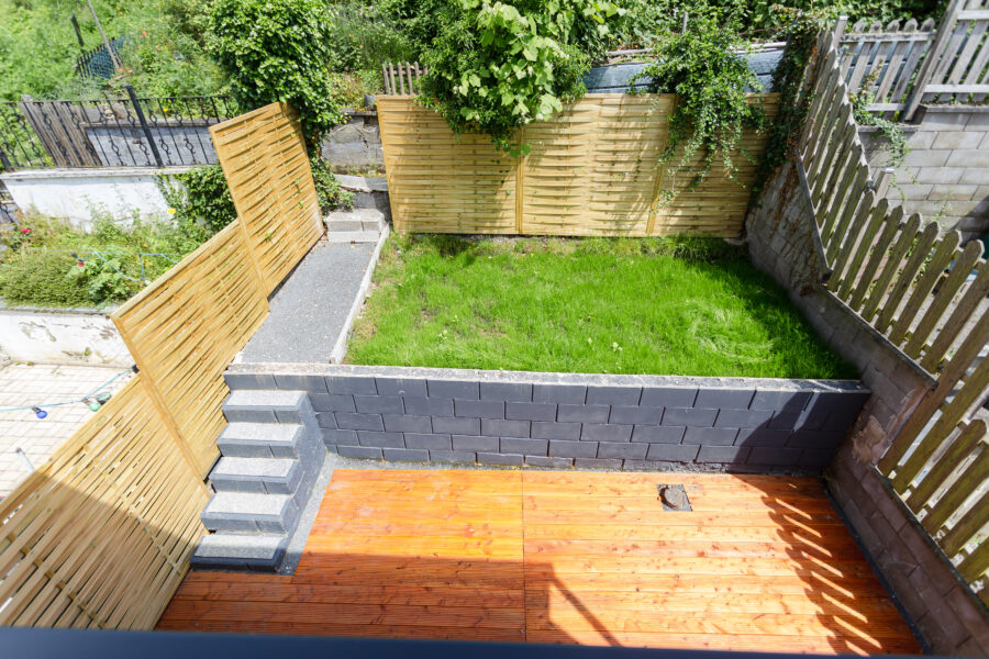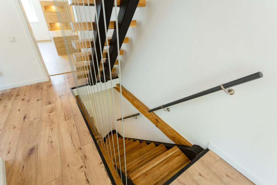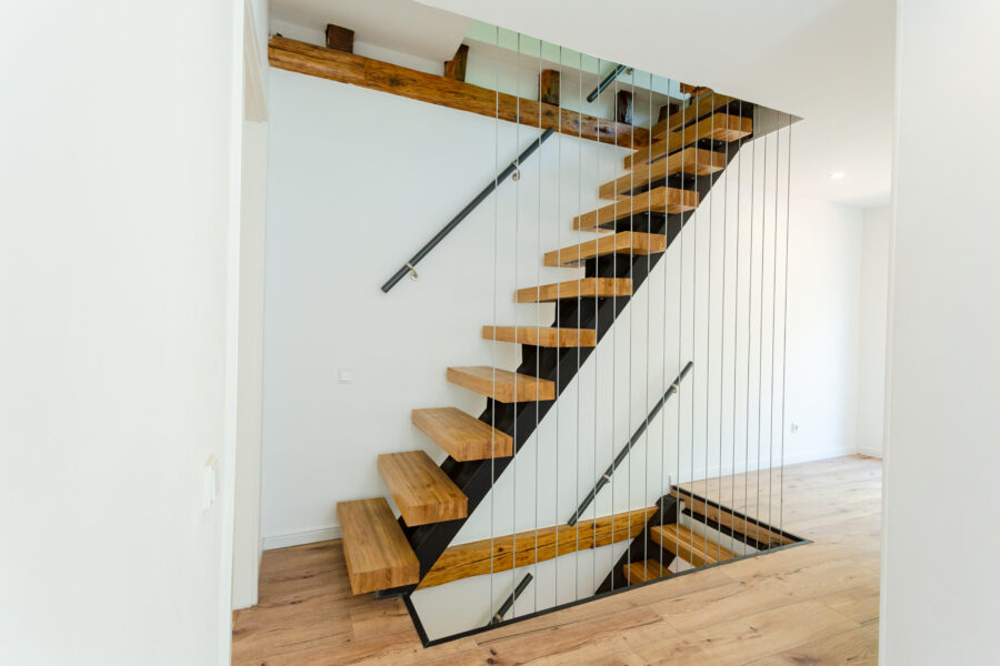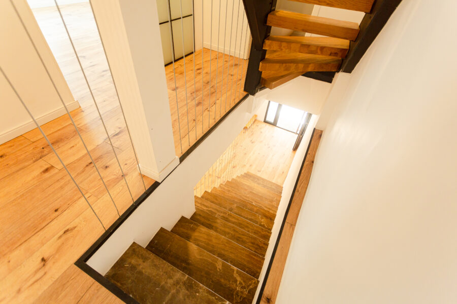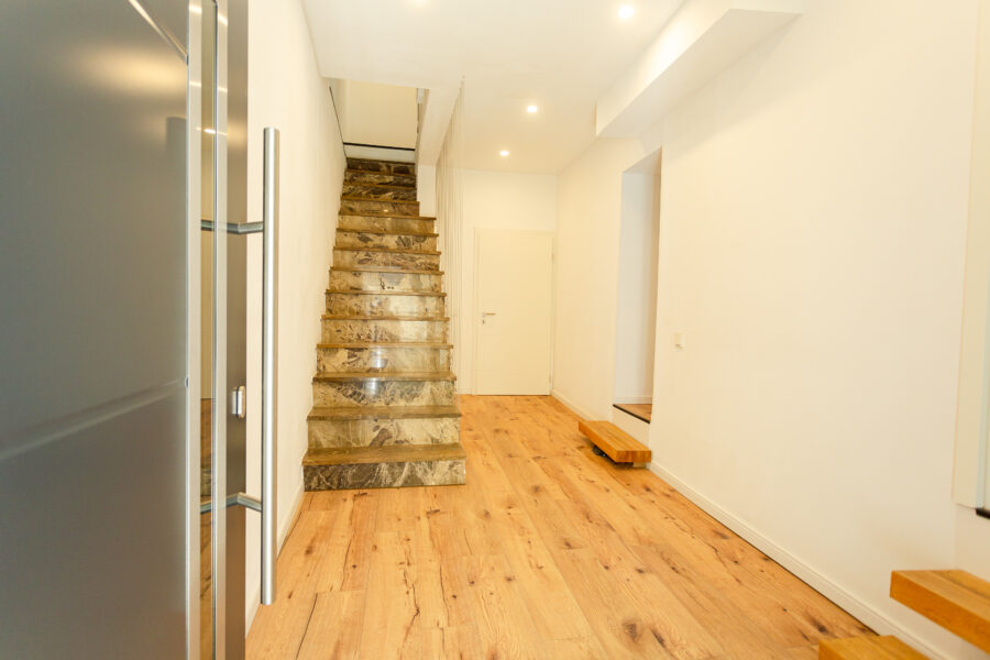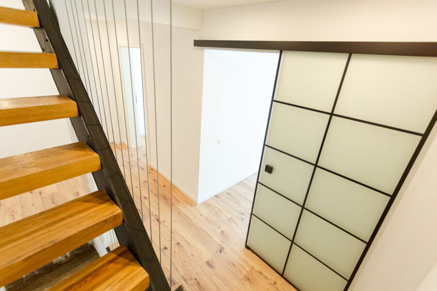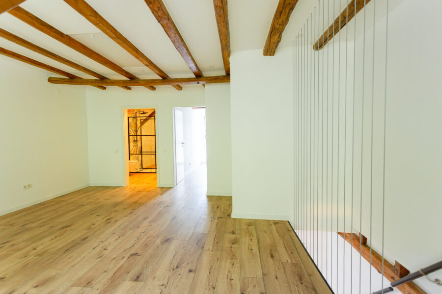 Die schöne Holztreppe führt ins erste Geschoss, wo sich zwei Schlafräume und ein Badezimmer befinden. Vom Flur aus gibt es einen Zugang zur Terrasse. Auch dieser wurde gerade erst zu neuem Glanz verholfen, damit man auch inmitten der Altstadt einen schönen Ruhepol hat und den Blick in die Weinberge genießen kann.