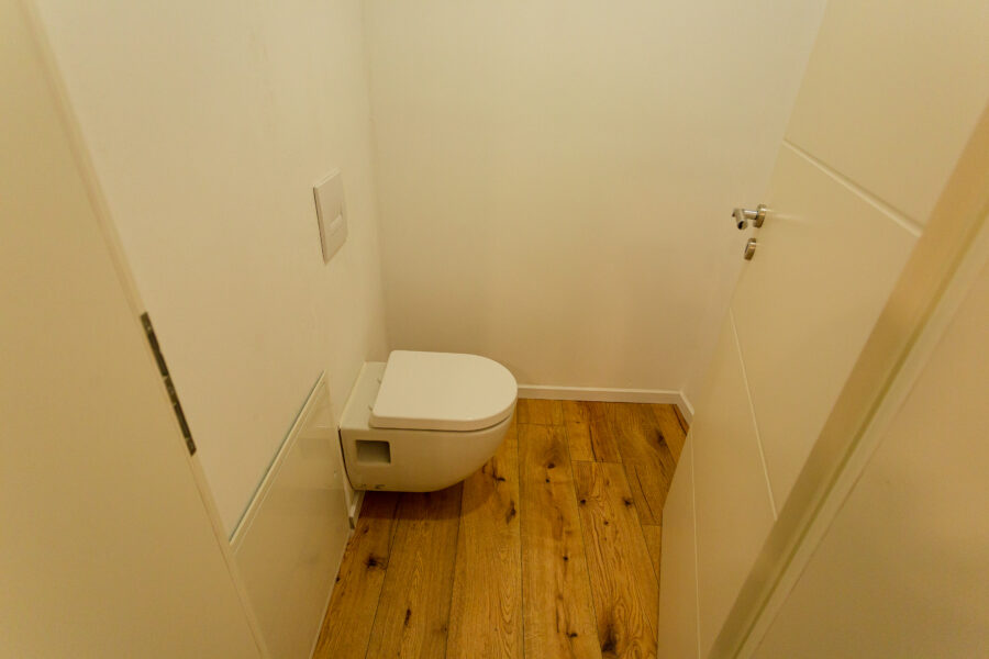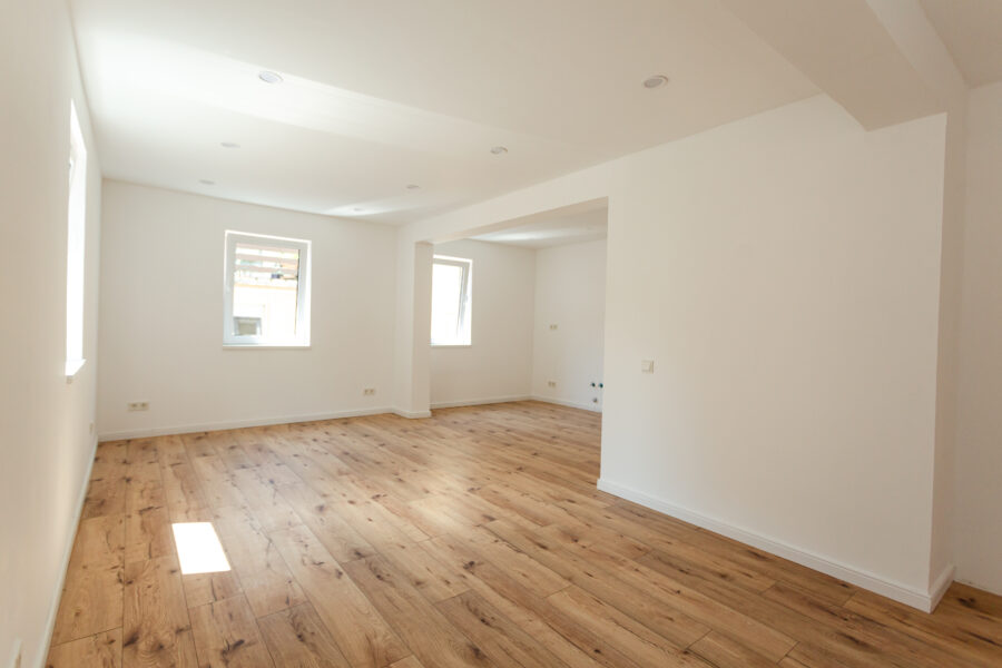 Eine weitere Etage offenbart einen riesigen Wohnbereich mit ausreichend Platz und bereits vorhandenen Anschlüssen für eine Küche. Der Erwerber dieser Immobilie ist somit völlig frei in seiner Küchenwahl. Ein weiteres kleines Zimmer und ein Gäste-WC vervollständigen diese Etage.