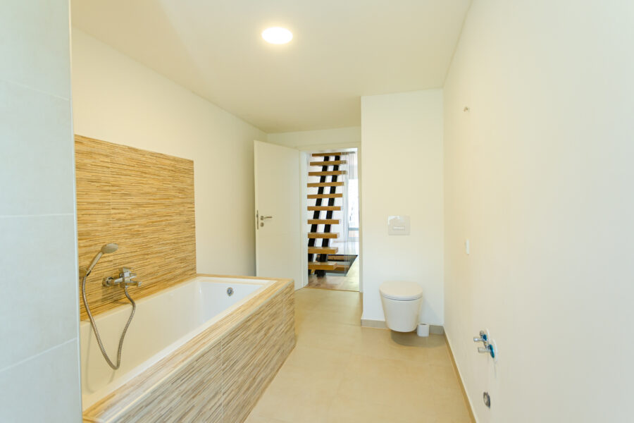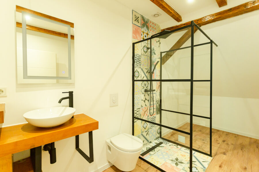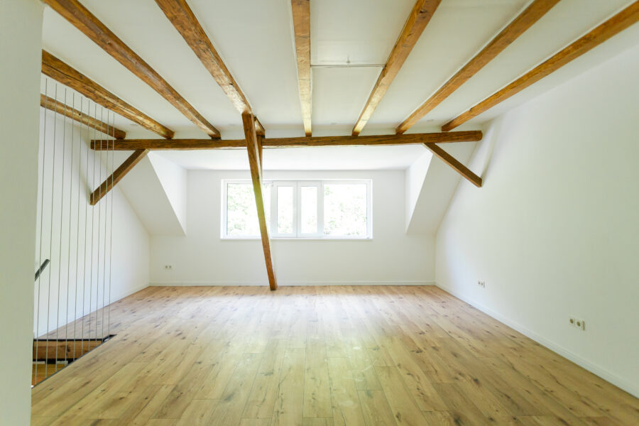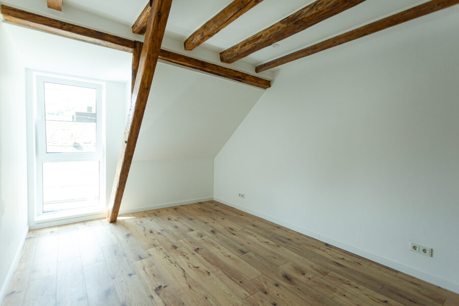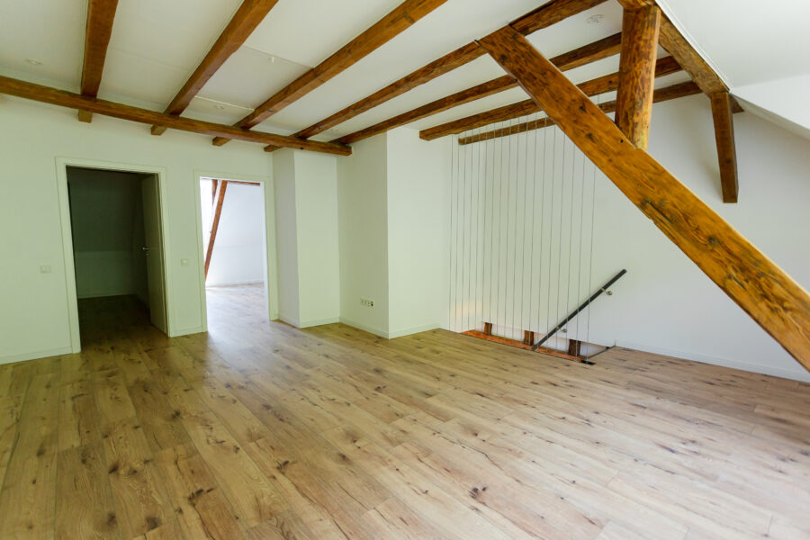 Das Dachgeschoss schlussendlich umfasst einen weiteren offenen und großzügigen Wohnbereich, ein Schlafzimmer und ein Badezimmer mit Dusche, welches durch die Kreativität des Eigentümers ein besonderes Schmuckstück ist. Die erhaltenen und neu aufgearbeiteten Holzbalken in diesem Geschoss lassen erkennen, dass man sich in einem alten Gebäude befindet, sämtliche Sanierungsarbeiten lassen es jedoch modern und neuwertig wirken.