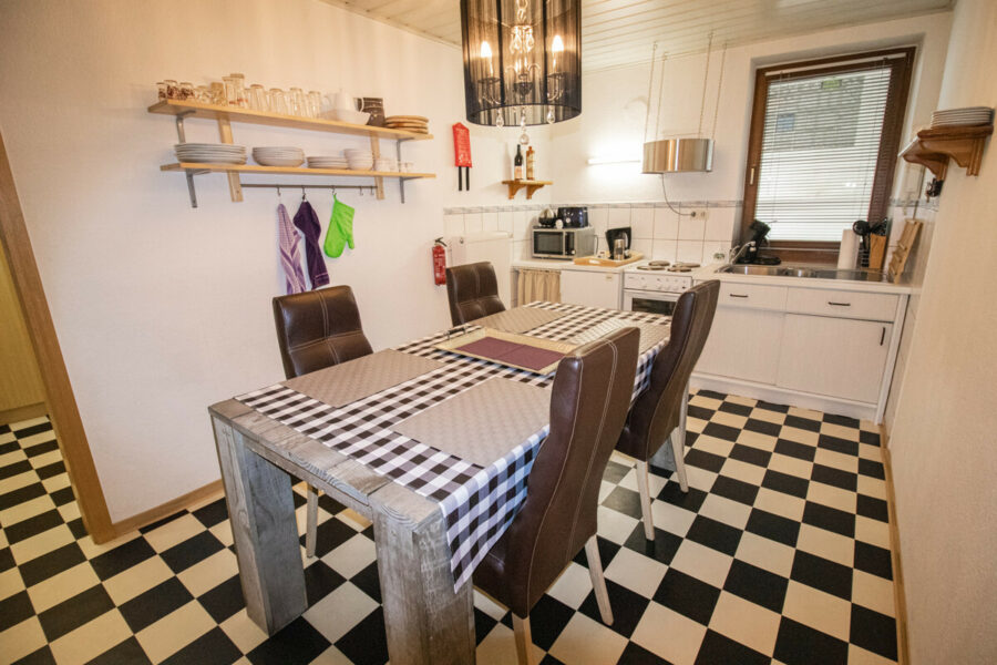 Ferienwohnung 1: Koch-Essbereich, Schlafzimmer mit Duschbad mit WC.