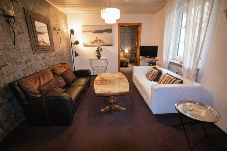1. OG: Flur, Doppelzimmer mit separatem Wohnzimmer und Duschbad mit WC,