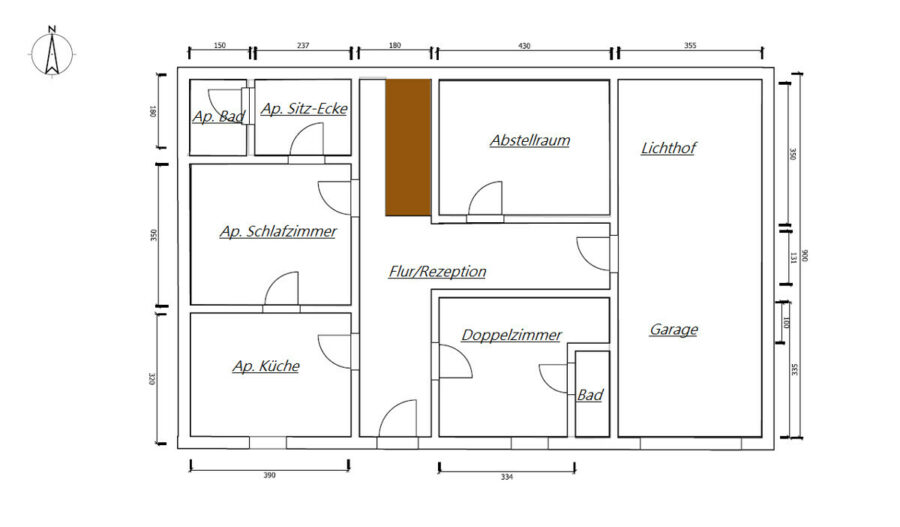 EG: Eingangsbereich mit Anmeldung, Doppelzimmer mit einem Duschbad mit WC, großer Vorratsraum, Zugang zur Garage, Garage,