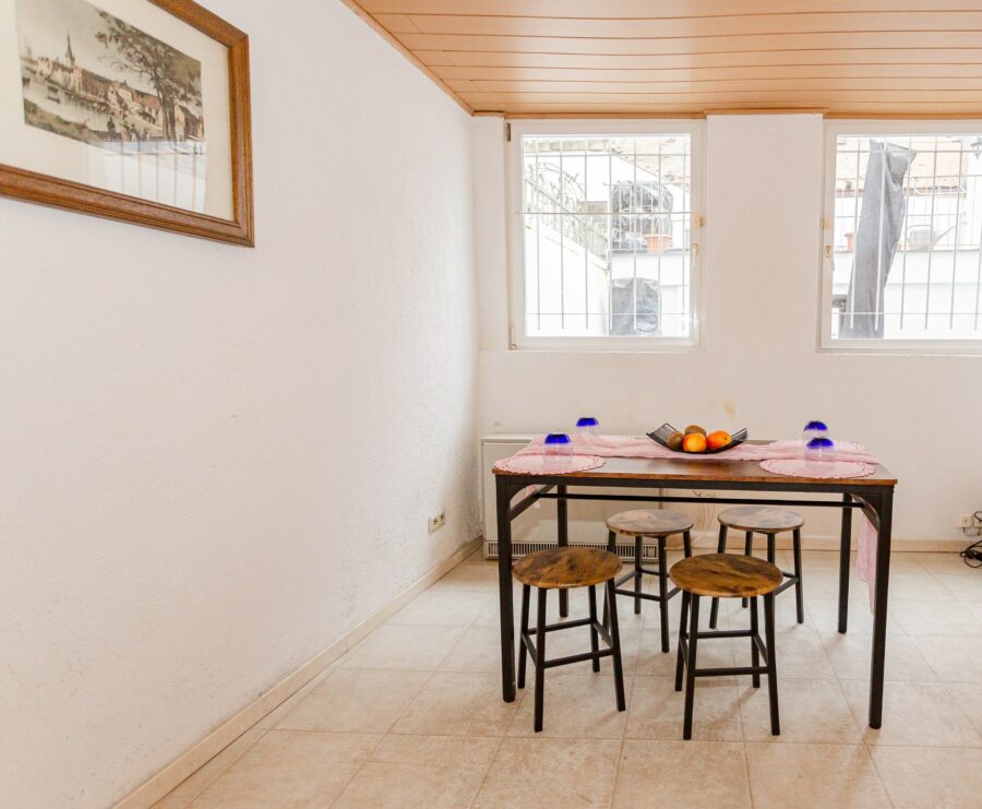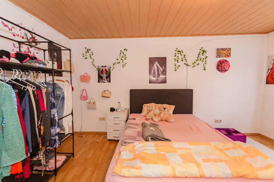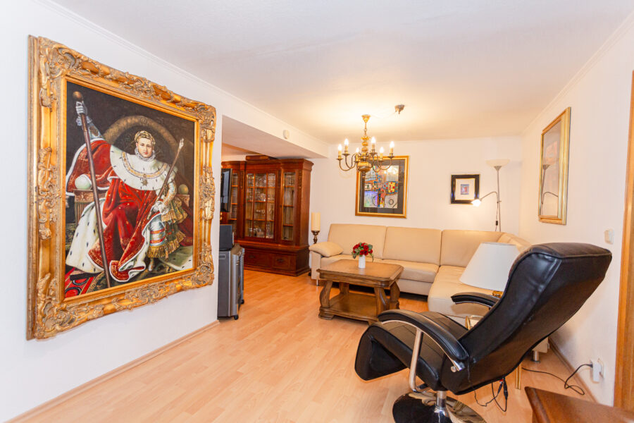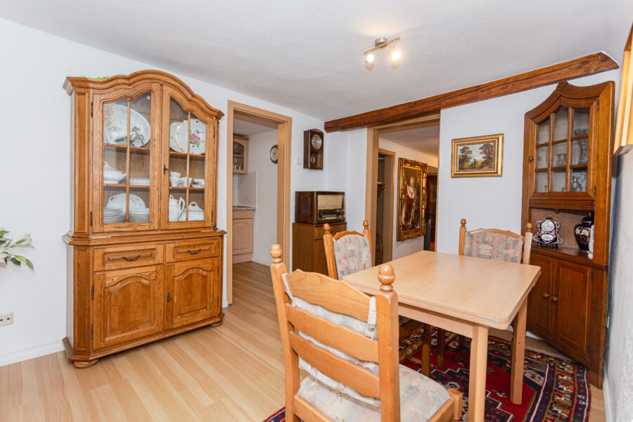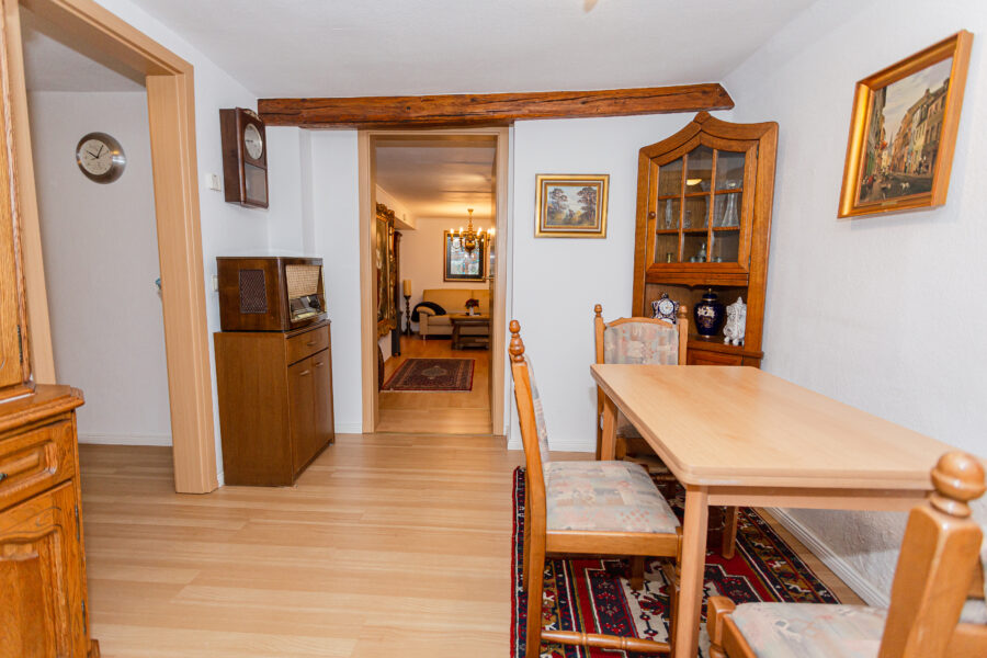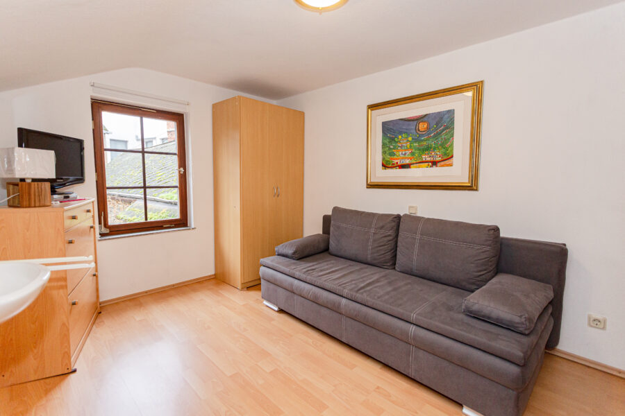 Der Anbau, welcher momentan fest vermietet ist, besteht aus drei Etagen, ist von der Wohnfläche her mit 61 m² jedoch etwas kleiner. Die Eingangstür befindet sich im Innenhof, von hier aus betritt man den Flur und kommt in die geräumige Küche mit genügend Platz für einen Essbereich. In der darüberliegenden Etage befindet sich ein schönes Schlafzimmer, und das Duschbad mit Fenster. In der obersten Etage schlussendlich ist das wirklich großzügige Wohnzimmer untergebracht, mit viel Charme erstreckt sich der Raum über die gesamte Fläche des Hauses. Der Innenhof verfügt über einen schönen Grillplatz, der mit einem großen Sonnenschirm vor der direkten Sonnenstrahlung geschützt werden kann.
