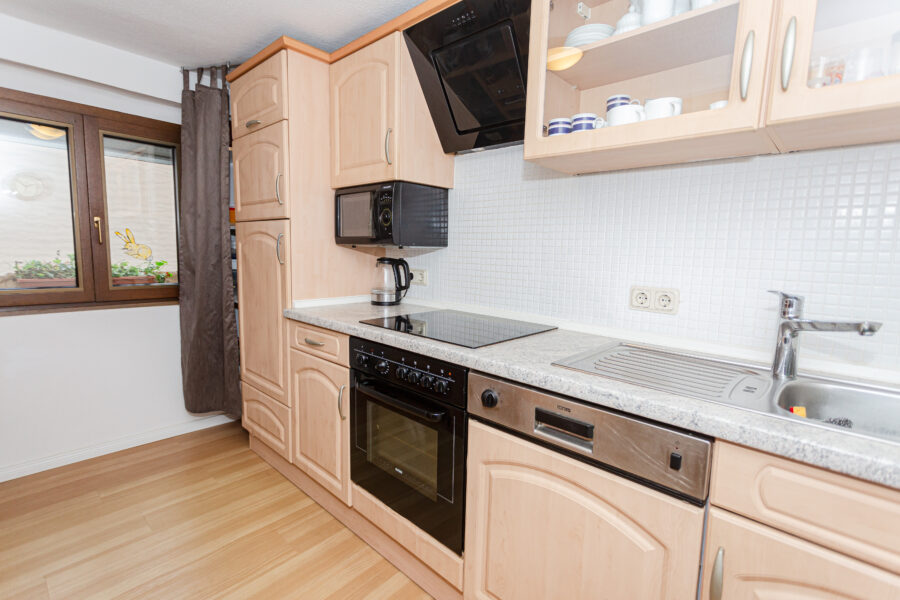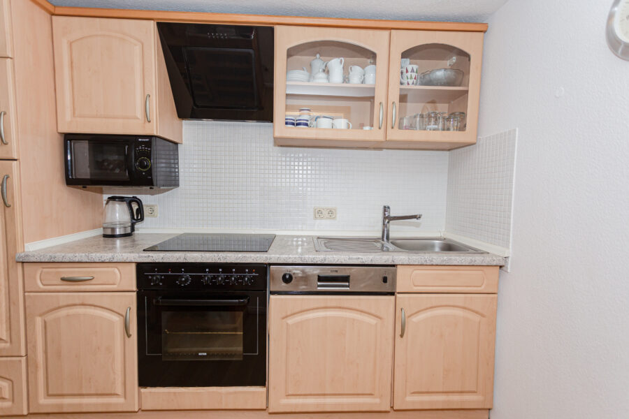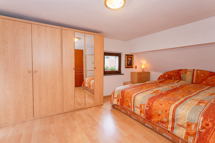 Das Haupthaus bietet Wohnraum auf zwei Ebenen. Es wird betreten über einen geräumigen Flur, von dem aus alle Zimmer erreichbar sind. Im Erdgeschoss befindet sich zudem das große Wohnzimmer mit Ofen, eine schöne Kochküche und ein Gäste-WC. In der oberen Etage sind die Schlafräume untergebracht und ein großzügiges Badezimmer, sowie ein Büro. Zudem hat man von einem der Schlafzimmer einen Zugang nach draußen auf die Terrasse. Diese ist auch in Saisonzeiten ruhig und bietet genug Platz, um die Sonnenstunden hier zu genießen.